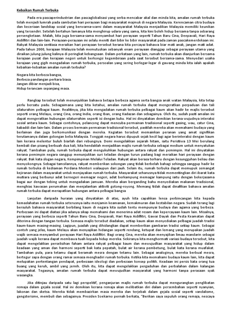 Https Edoc Pub Download Syarahan Perpaduan Pdf Free Html from Assalamualaikum dan salam sejahtera jalinan masyarakat tempat: Amalan rumah terbuka ini memberi ruang kepada masyarakat untuk menjalin kemesraan walaupun mereka menyambut perayaan yang berbeza. Oleh itu,amalan rumah terbuka ini wajar diteruskan dalam masyarakat. Yang berhormat dato' law choo kiang Apabila rumah terbuka diadakan,masyarakat akan dapat mengenali adat dan budaya kaum lain. Selain itu, rumah terbuka dapat memupuk semangat kejiranan dalam masyarakat untuk menjayakan rumah terbuka. Apabila tiba sahaja musim perayaan. Aidilfitri misalnya disambut meriah setiap tahun oleh semua kaum di negara ini tanpa mengira agama dan keturunan.